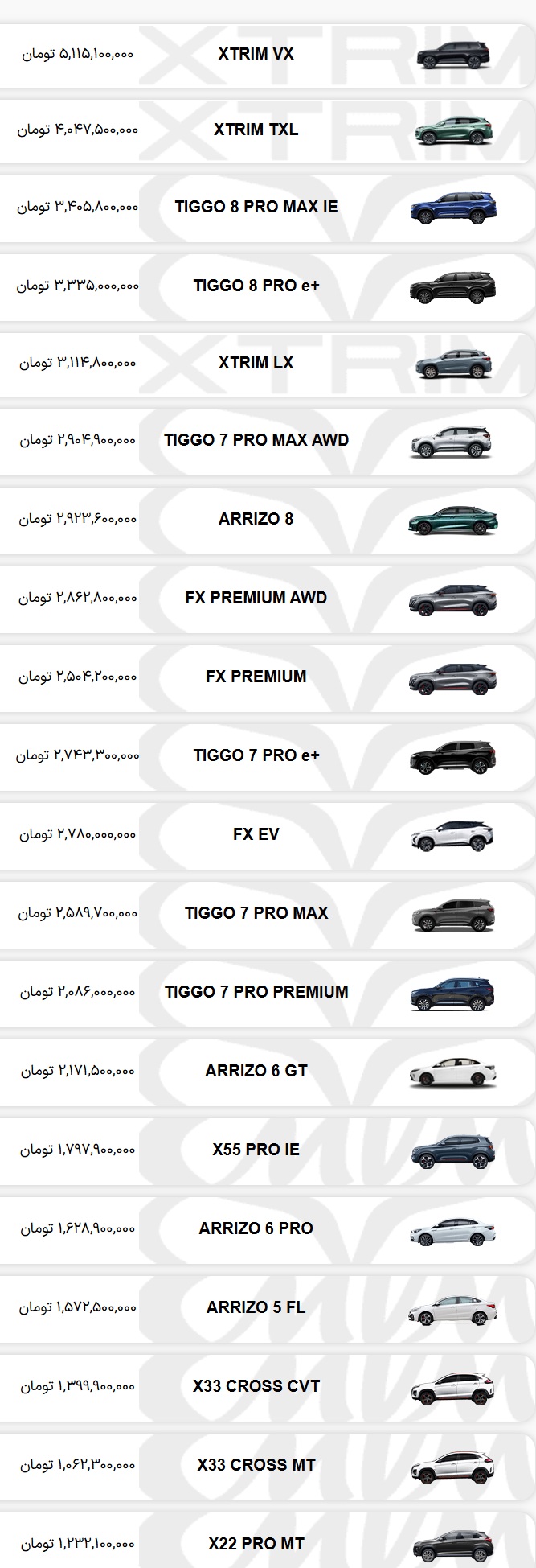 قیمت کارخانه محصولات مدیران خودرو ام وی ام و فونیکس (چری) / مهر ۱۴۰۴