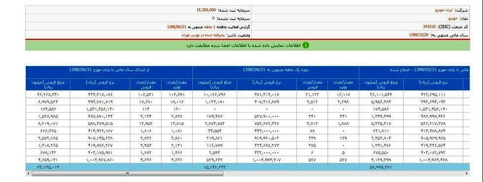 شرکت در ۶ ماهه ۹۷ با فروش بیش از ۲۰۶ هزار دستگاه خودرو با بهای تمام شده ۱۲۲۰۸ هزار میلیاردی همراه شده است در وضعیتی که ایران خودرو در ۶ ماهه سال ۹۸ با فروش بیش از۱۵۶ هزار دستگاه خودرو با بهای تمام شده ۱۱۹۵۰ میلیاردی همراه شده است.