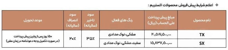 بروزرسانی ۱۶ آذر ۱۴۰۳برند اکستریم از ساعت ۱۰ صبح روز شنبه ۱۷ آذر ماه فروش نقدی دو خودروی وی ایکس و تی ایکس ال به صورت تک مرحله ای، دو مرحله‌ای و سه مرحله‌ای (بدون کارمزد) آغاز خواهد کرد.
