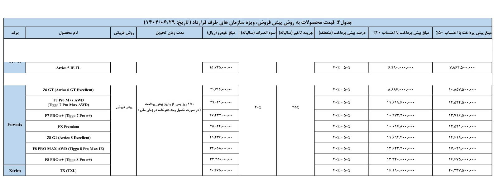 بروزرسانی ۸ مرداد ۱۴۰۴: شرایط پیش فروش ۳ محصول فونیکس مدیران خودرو براساس جدول زیر از امروز چهارشنبه ۸ مرداد آغاز میگردد.
