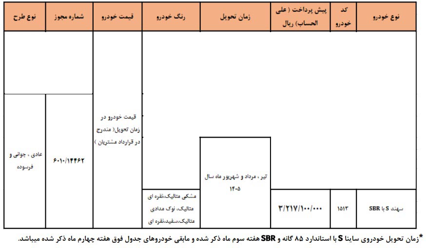 | سهند S | ۲۳۱.۰۰۰.۰۰۰ | دی الی اسفند ۱۴۰۳ (هفته چهارم) |