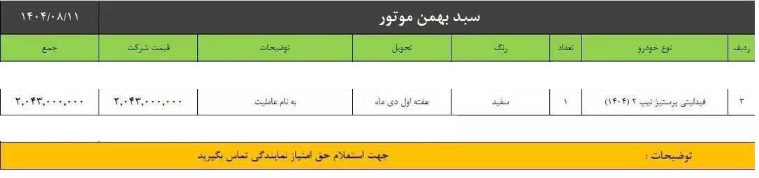 بروزرسانی ۱۱ آبان ۱۴۰۴از امروز یکشنبه، سبد جدید فروش محصولات شرکت بهمن موتور با عرضه دو محصول در کلیه نمایندگی‌های مجاز این شرکت فعال شده است.