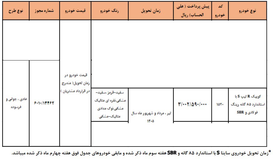 | کوییک R تیپ S | سفید قرمز-سفید مشکی-نقره ای مشکی | ۲۰۹.۵۱۷.۰۰۰ | مرداد - شهریور و مهر ۱۴۰۴ |
