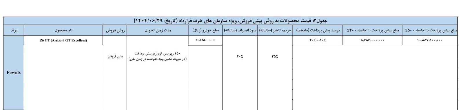 بروزرسانی ۲۰ شهریور ۱۴۰۳: قیمت و شرایط فروش نقدی و اقساطی برخی از محصولات برند فونیکس از امروز سه شنبه ۲۰ شهریورماه ۱۴۰۳ در نمایندگی های شرکت مدیران خودرو مطابق جدول ذیل اعلام میگردد.