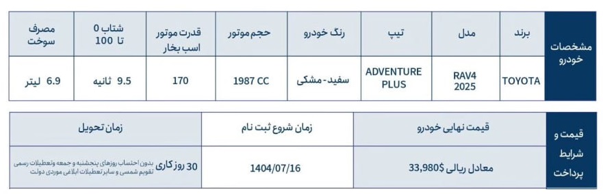 بروزرسانی ۲۸ مرداد ۱۴۰۴: نماینده رسمی فروش محصولات تویوتا در ایران، شرایط جدیدی را برای ثبتنام و فروش مدل تویوتا راو۴ (RAV4) مدل ۲۰۲۵ اعلام کرده است. این شرایط شامل فروش اقساطی با قیمت قطعی و تحویل فوری است.