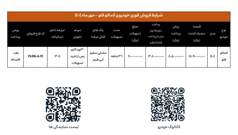شرایط فروش لاماکو فلو / مهر ۱۴۰۴
