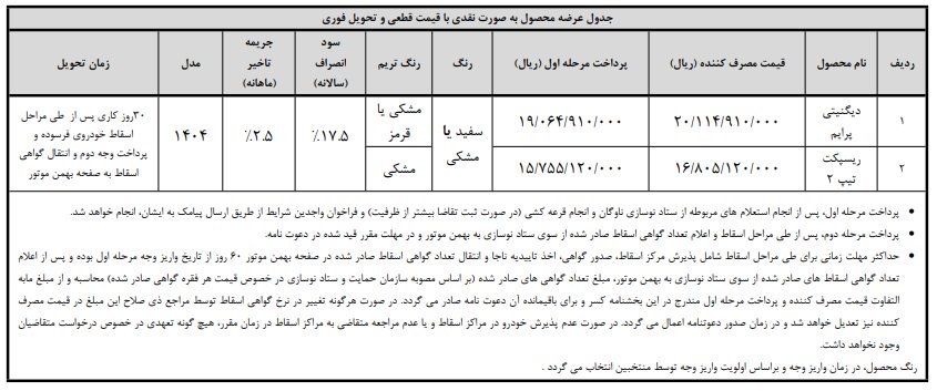 منتخبین واجد شرایط میتوانند از ساعت ۱۰:۰۰ صبح روز چهارشنبه مورخ ۱۴۰۴/۰۷/۰۹ تا ساعت ۲۴:۰۰ روز سهشنبه مورخ ۱۴۰۴/۰۷/۱۵، نسبت به واریز وجه خودرو به صورت آنلاین اقدام نمایند.