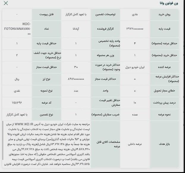 بروزرسانی ۱۹ آبان ۱۴۰۴: به اطلاع میرساند، تالار خودروی بورس کالای ایران در روز چهارشنبه ۲۱ آبان ماه ۱۴۰۴ میزبان عرضه جدیدی خواهد بود. شرکت ایرانخودرو دیزل در این روز، تعداد ۳۵ دستگاه ون فوتون وانا را عرضه خواهد کرد. موعد تحویل این ونها، پنجم بهمن ماه ۱۴۰۴ تعیین شده است.