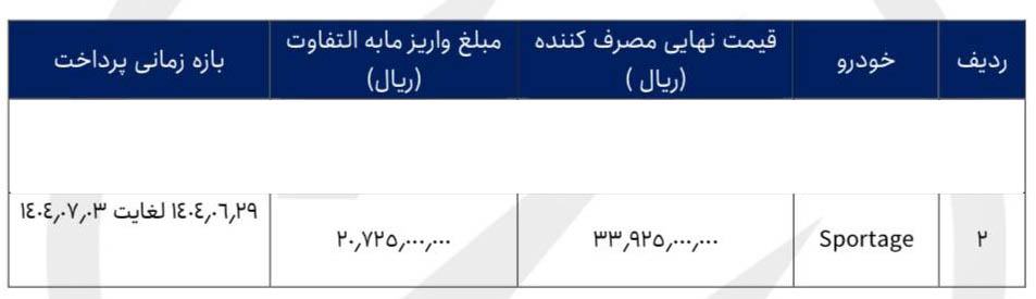 - مبلغ واریز برای متقاضی ۵۰٪ قیمت علیالحساب خودرویی است که در جدول زیر مشخص شده است.
