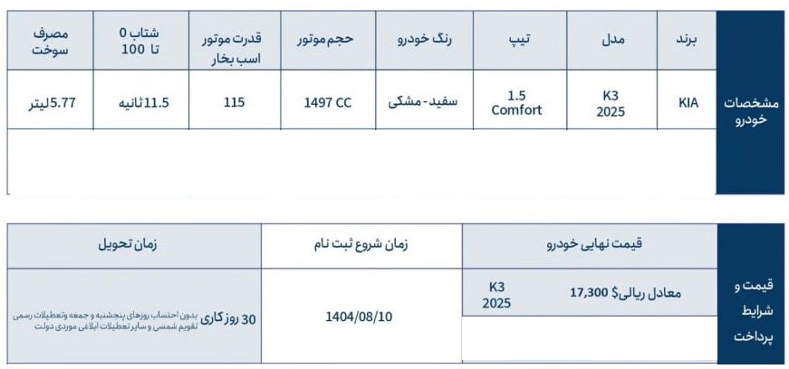 شرایط فروش کیا K3 / آبان ۱۴۰۴